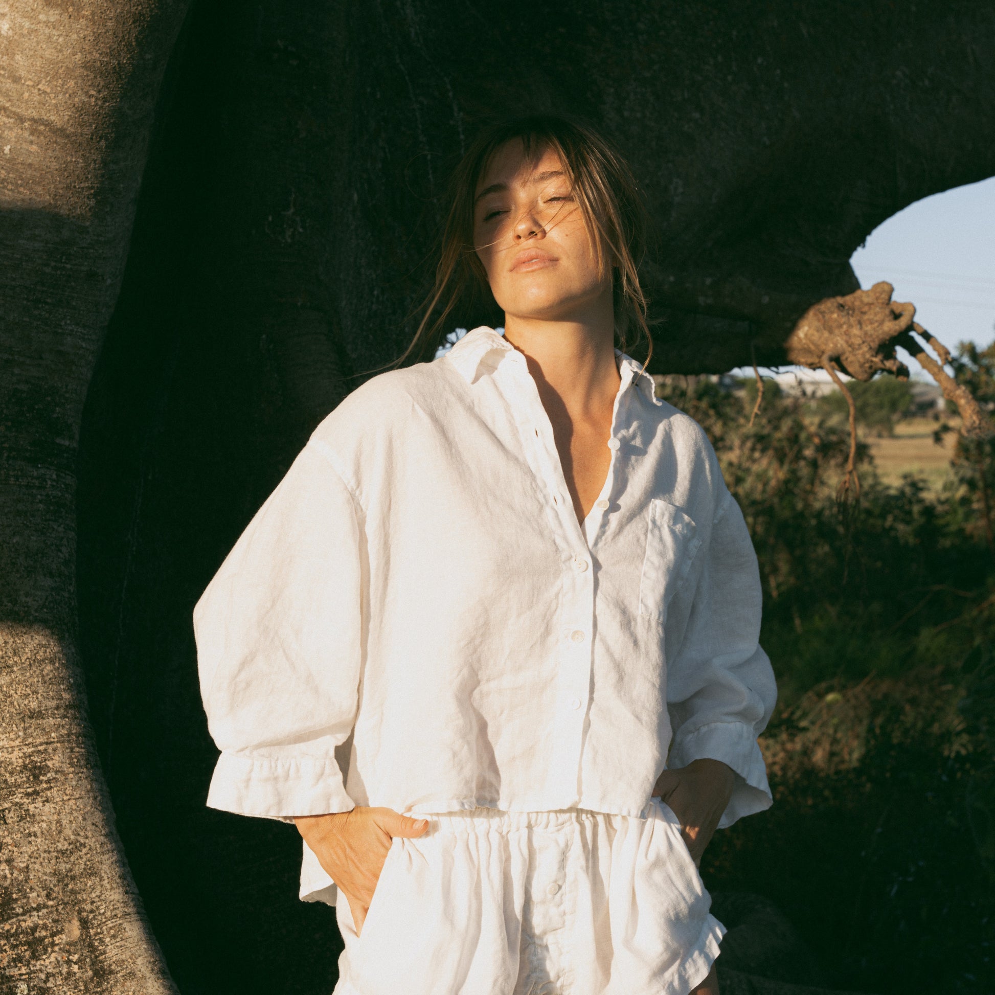From our first sleep collection, the Alchemy Sleep Set, is the essential you will reach for every day. Combining classic style with casual comfort, the relaxed button-up shirt features a wide collared neckline, button front opening, and wide elbow-length sleeves with buttons. Paired with shorts that have a scrunchy waistband for an effortless fit, this simple, soft set will fit naturally into your daily home routine.